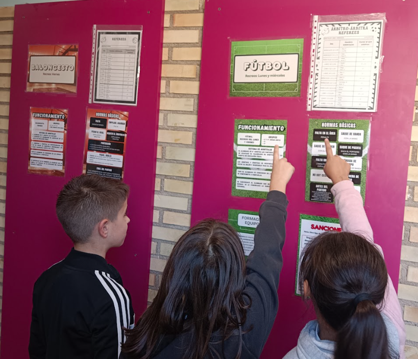 - Lunes y miércoles: juegos con balones y pelotas. Además, el alumnado de 6º se convierte en árbitro/a de los partidos de fútbol de 3º a 6º, ¡todo un ejemplo de responsabilidad